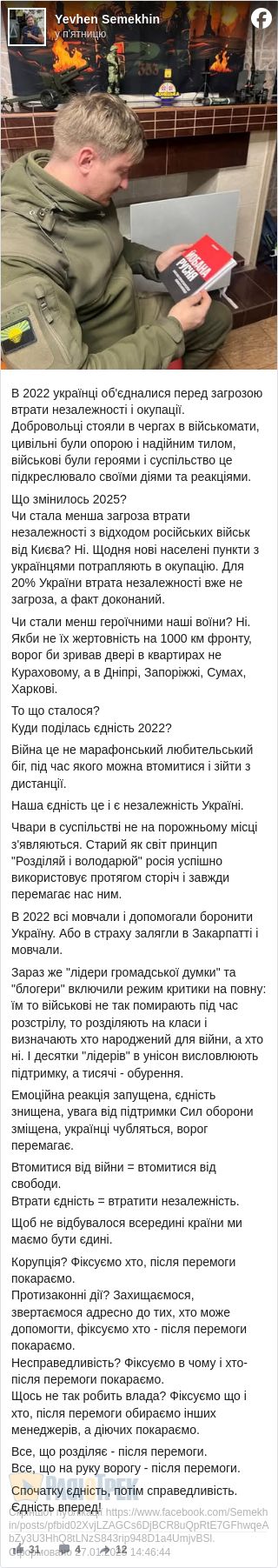 Акценти Святослав розставляє правильно і звертається з окопу до всіх нас: