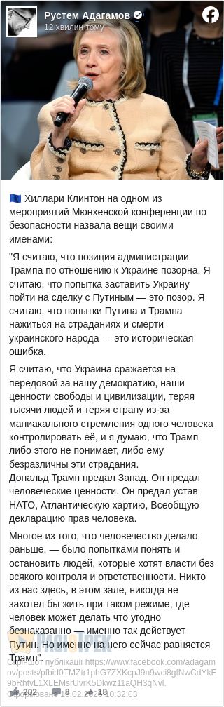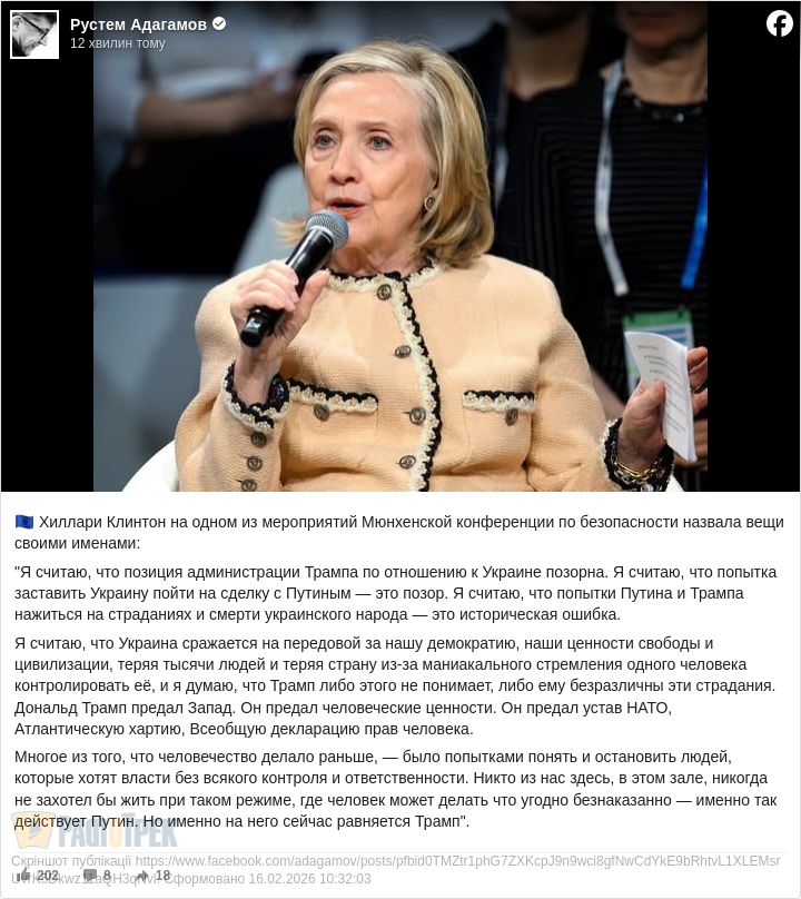 Як вважає Рустем Адагамов: «Гілларі Клінтон на одному із заходів Мюнхенської конференції з безпеки назвала речі своїми іменами».