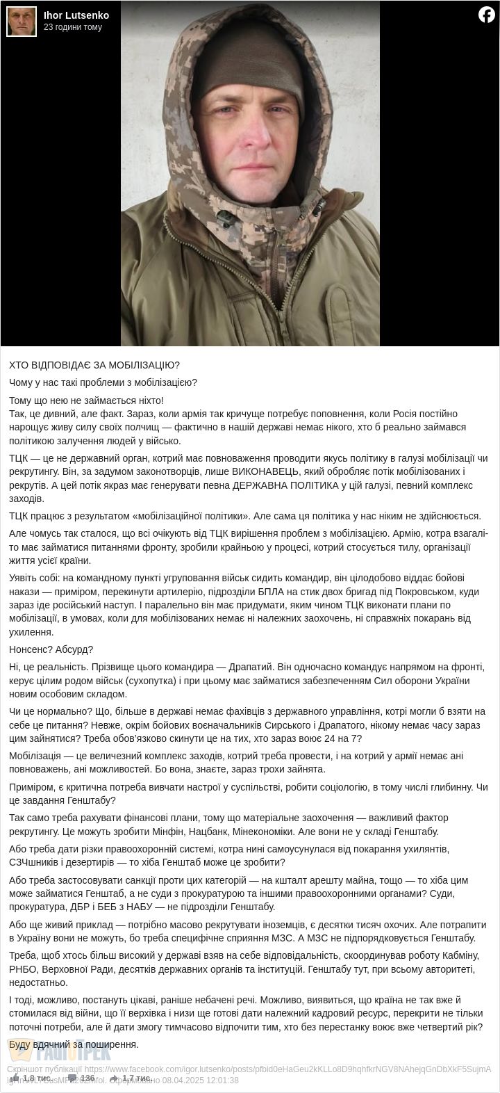 «Хто відповідає за мобілізацію?... Ніхто?», - Ігор Луценко ставить питання руба (ФОТО)