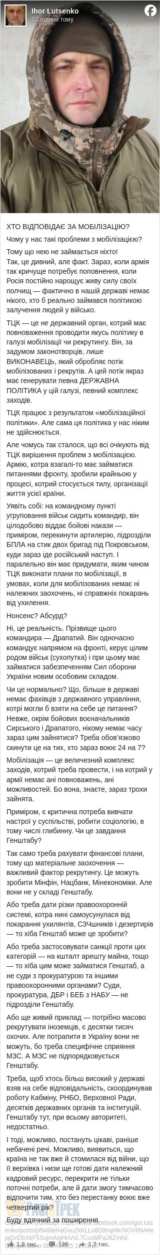 Мобілізація — це величезний комплекс заходів, котрий треба провести, і на котрий у армії немає ані повноважень, ані можливостей. Бо вона, знаєте, зараз трохи зайнята.