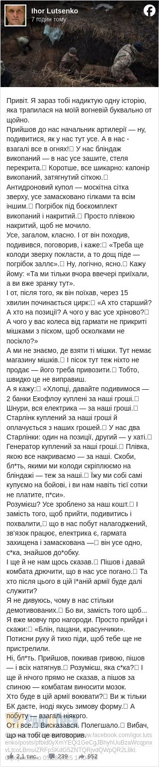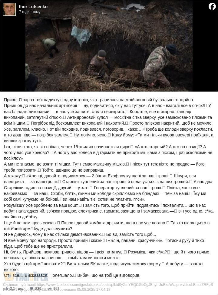Плівка, якою все накриваємо — за наші. Скоби, бл*ть, якими ми колоди скріплюємо на бліндажі — теж за наші.Їжу ми собі самі купуємо на бойові, і ви нам навіть тієї сотки не платите, п*си».