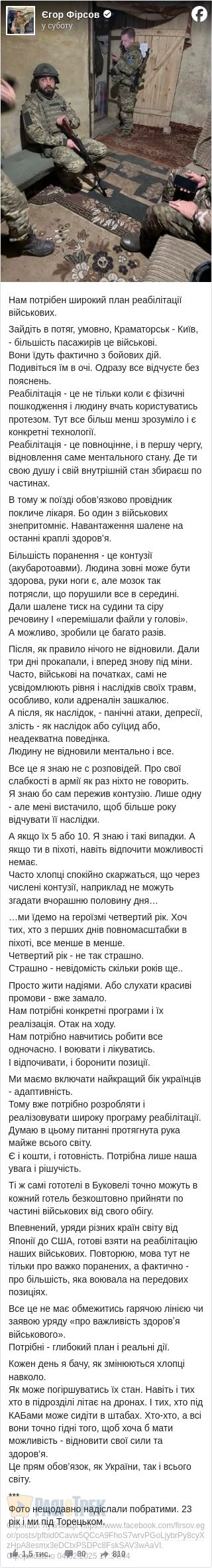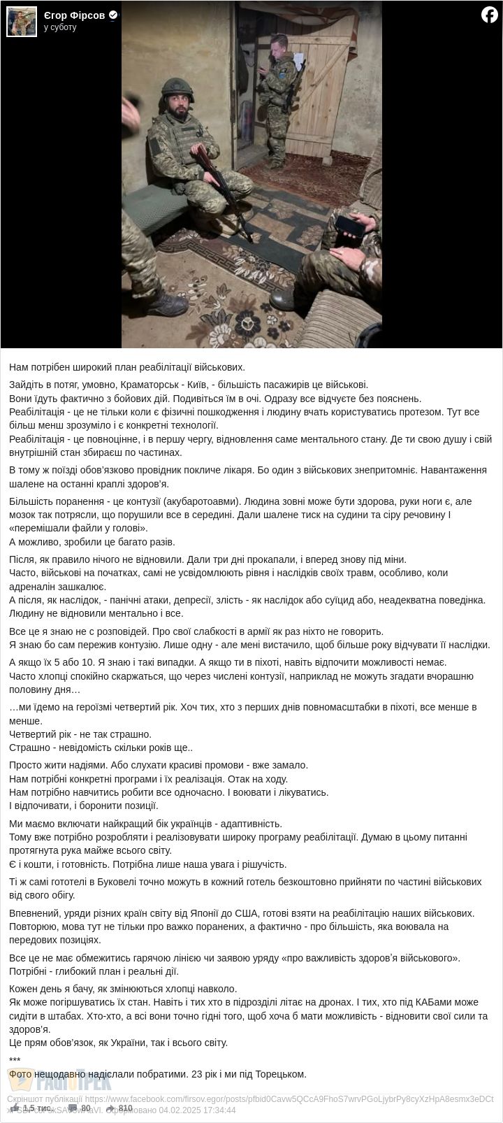 Важливу тему в своєму черговому дописі піднімає Єгор Фірсов. Йдеться, передовсім про невидимі, але важкі та серйозні травми війни, що їх зазнають наші герої.