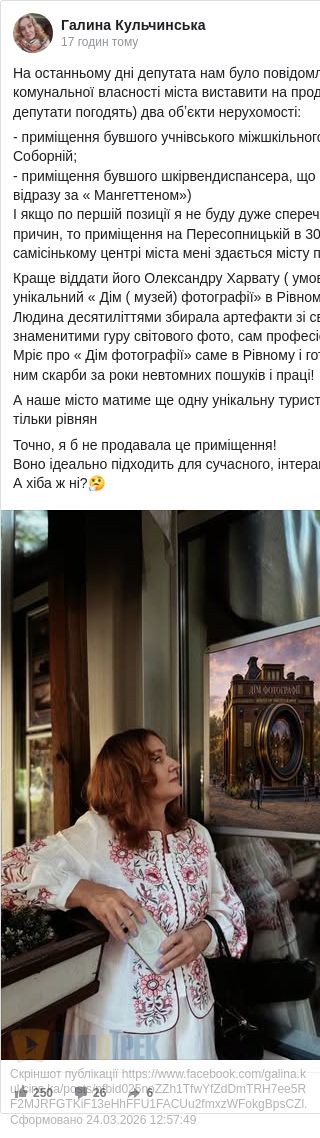 Депутат міської ради Галина Кульчинська пропонує це приміщення – не продавати. Далі текст її ФБ-допису: