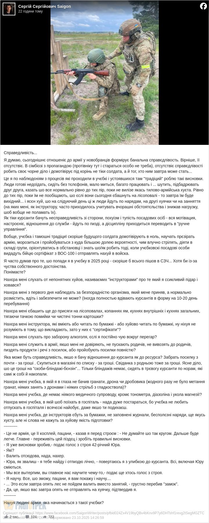Український письменник і військовий ЗСУ Сергій Сайгон (Лещенко) на своїй ФБ-сторінці озвучив, яка демотивує новобранців ще на самому початку їх військової служби – у навчальних центрах.
