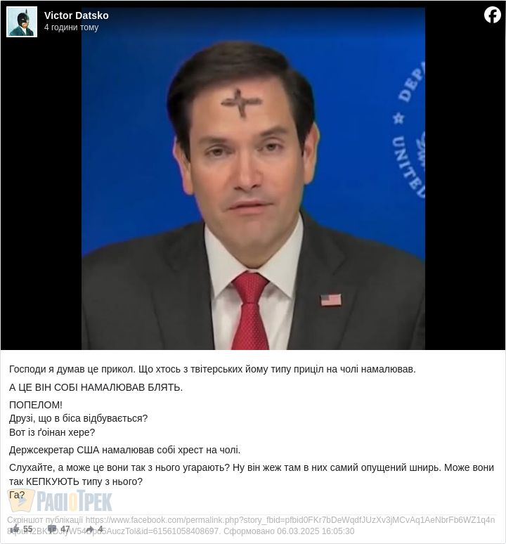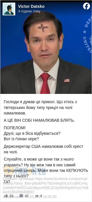 Так, це не був чийсь жарт над Марком Рубіо. Вчора держсекретар США вийшов ефір із виразним хрестом на чолі.
