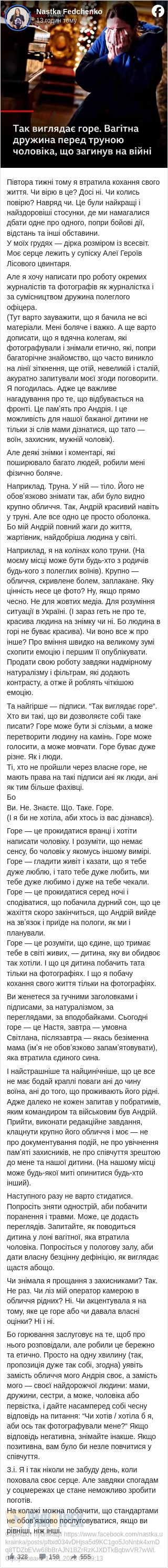 (Тут варто зауважити, що я бачила не всі матеріали. Мені боляче і важко. А ще варто дописати, що я вдячна колегам, які фотографували і знімали етично, які, попри багаторічне знайомство, що часто виникло на лінії зіткнення, ще отій, невеликій і сталій, акуратно запитували моєї згоди поговорити. Я погодилась. Адже це важливе нагадування про те, що відбувається на фронті. Це памʼять про Андрія. І це можливість для нашої бажаної дитини не тільки зі слів мами дізнатися, що тато — воїн, захисник, мужній чоловік).