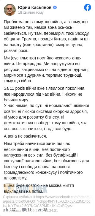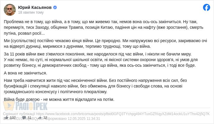 Ми (суспільство) постійно чекаємо кінця війни. Це природно. Ми напружуємо всі ресурси, закриваємо очі на відверті дурниці, миримося з дурнями, терпимо труднощі, тому що війна.