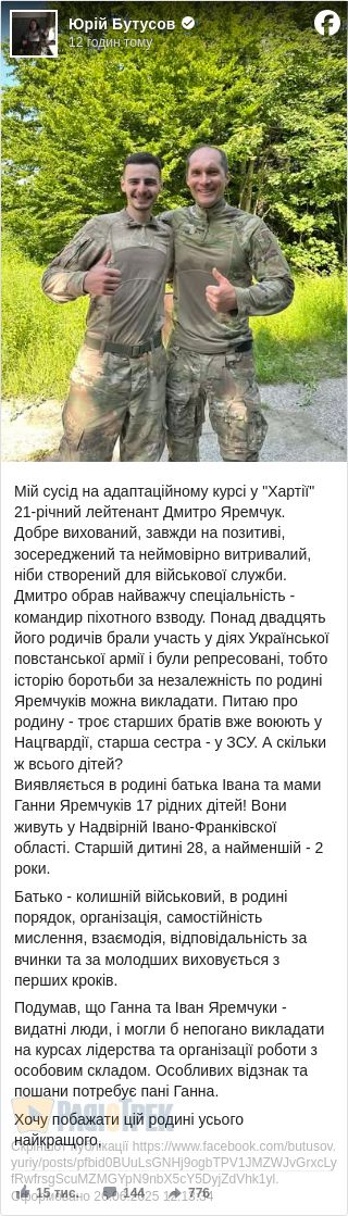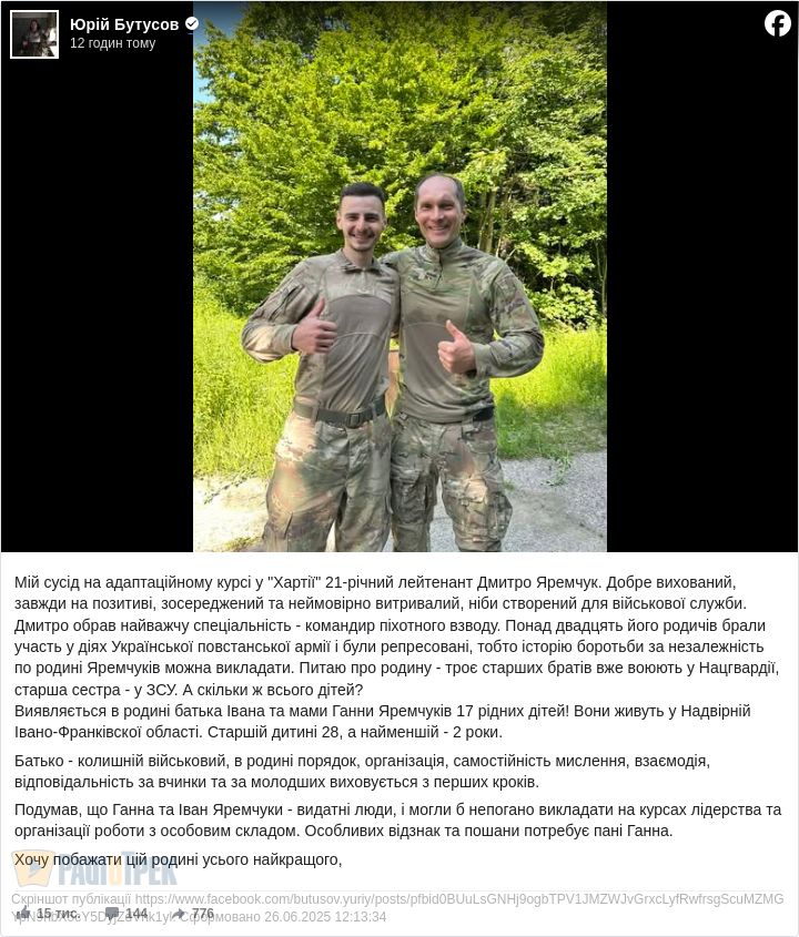 Подумав, що Ганна та Іван Яремчуки – видатні люди, і могли б непогано викладати на курсах лідерства та організації роботи з особовим складом. Особливих відзнак та пошани потребує пані Ганна.