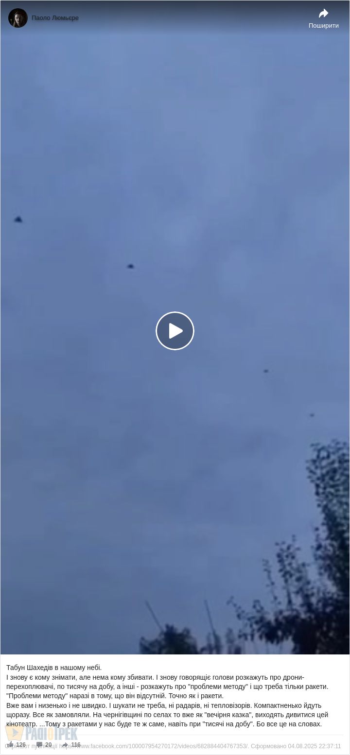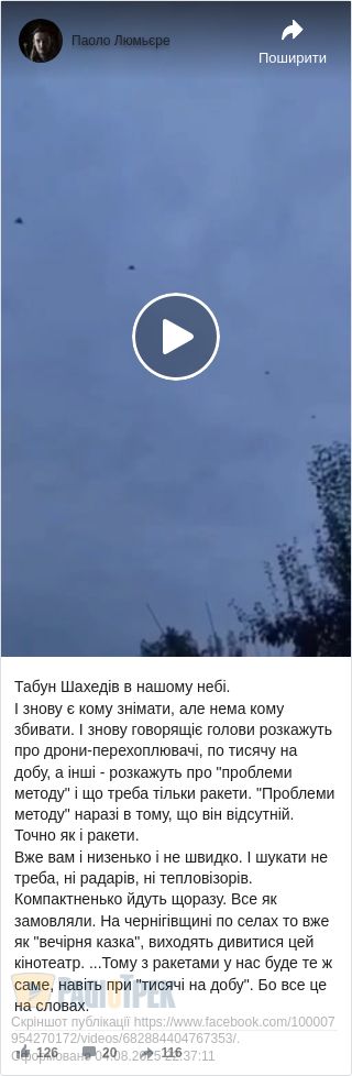 Паоло Лумьєре на тлі чергової «Шахедної» атаки публікує відео їх прольотів і пише: