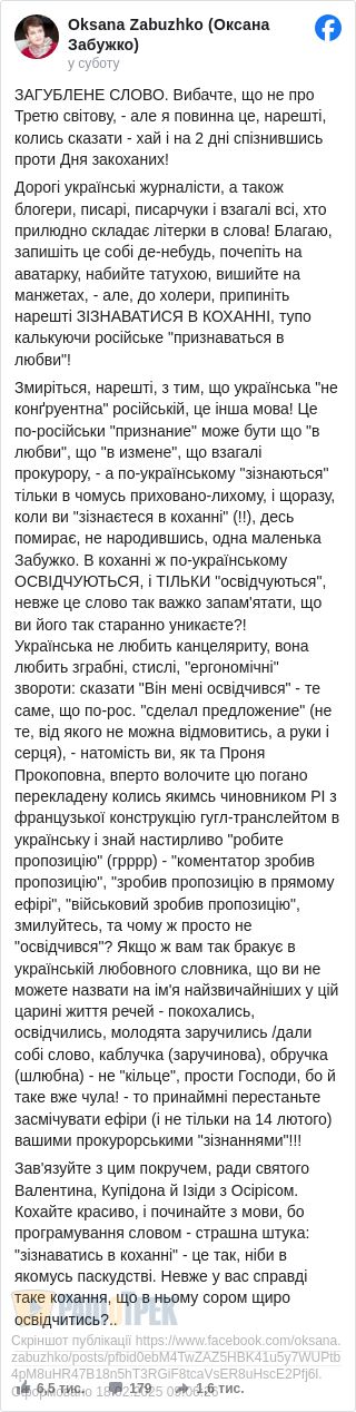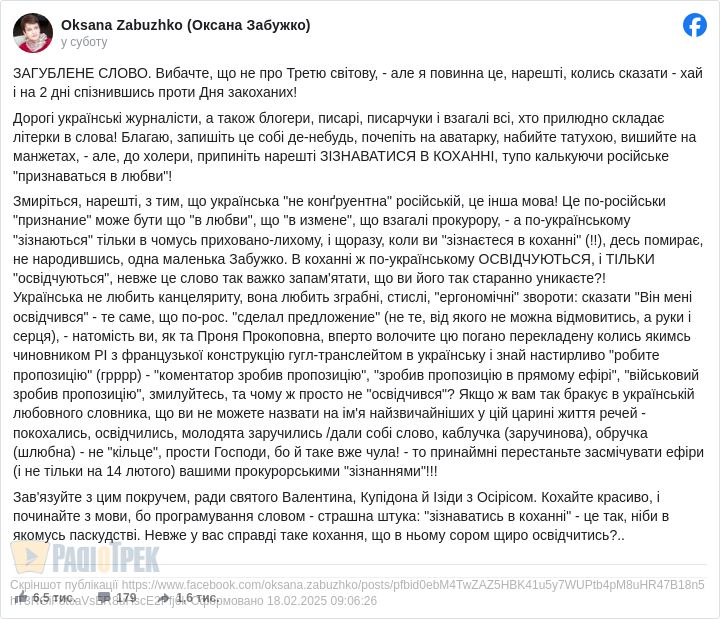 Якщо ж вам так бракує в українській любовного словника, що ви не можете назвати на ім'я найзвичайніших у цій царині життя речей – покохались, освідчились, молодята заручились /дали собі слово, каблучка (заручинова), обручка (шлюбна) – не «кільце», прости Господи, бо й таке вже чула! – то принаймні перестаньте засмічувати ефіри (і не тільки на 14 лютого) вашими прокурорськими «зізнаннями!!!» – сказала письменниця.