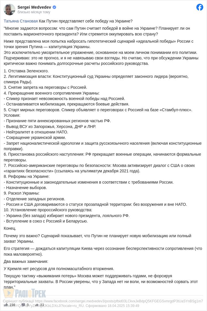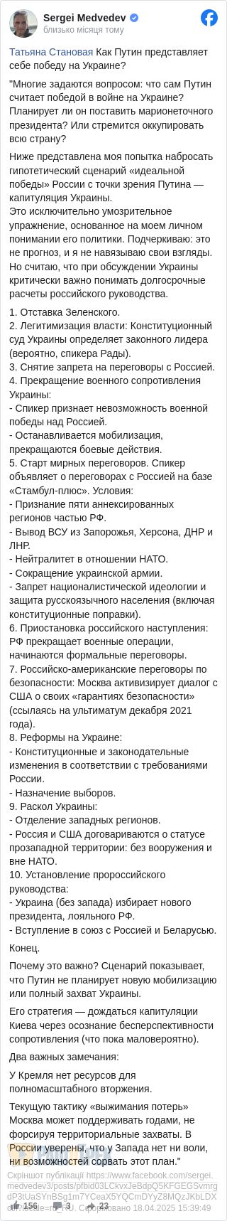 Виклад можливої позиції Кремля подає Тетяна Станова, допис якої активно обговорюють в мережі: