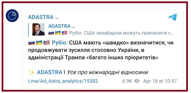 Держсекретар США Марко Рубіо заявив кільком журналістам біля трапу свого літака в паризькому аеропорту Ле Бурже, що США готові відмовитись від спроб досягти миру в Україні, якщо ближчими днями побачаться, що ця мета є недосяжною.