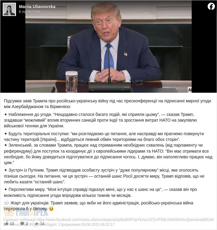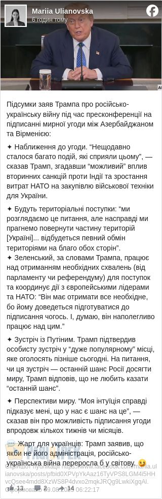 - Будуть територіальні поступки: «ми розглядаємо це питання, але насправді ми прагнемо повернути частину територій [Україні]... відбудеться певний обмін територіями на благо обох сторін».