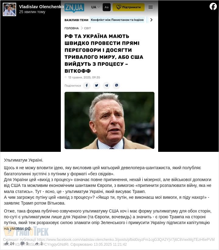 А чим загрожує путіну цей «вихід з процесу»? «Якщо ти, путін, не виконаєш мої вимоги, я піду нахєр!» - заявляє Трамп ротом Вітькова.