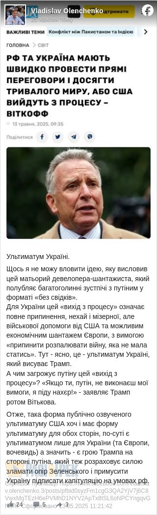 Щось я не можу вловити ідею, яку висловив цей матьорий девелопера-шантажиста, який полюбляє багатогодинні зустрічі з путіним у форматі «без свідків».