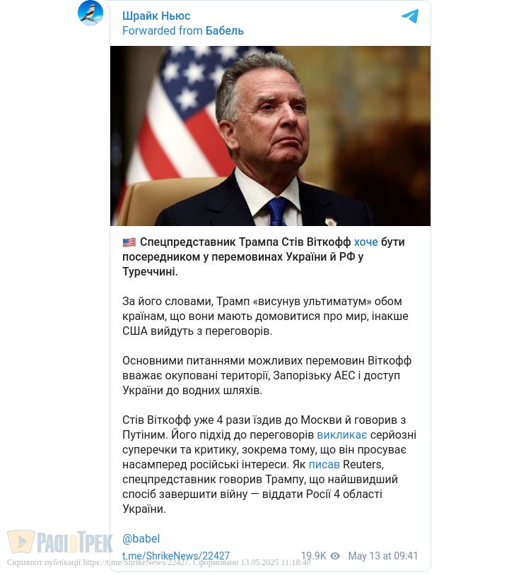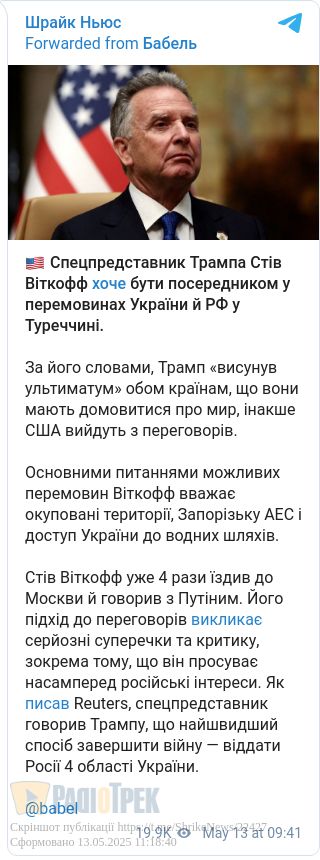 Отже, сьогодні ключова новина це Віткофф та його досить дивна заява, начебто адресована Росії та Україні.