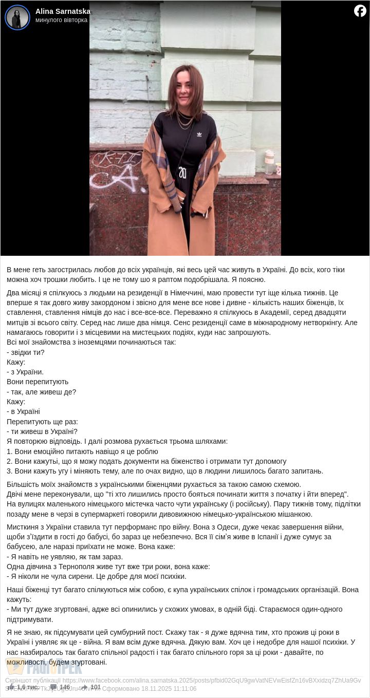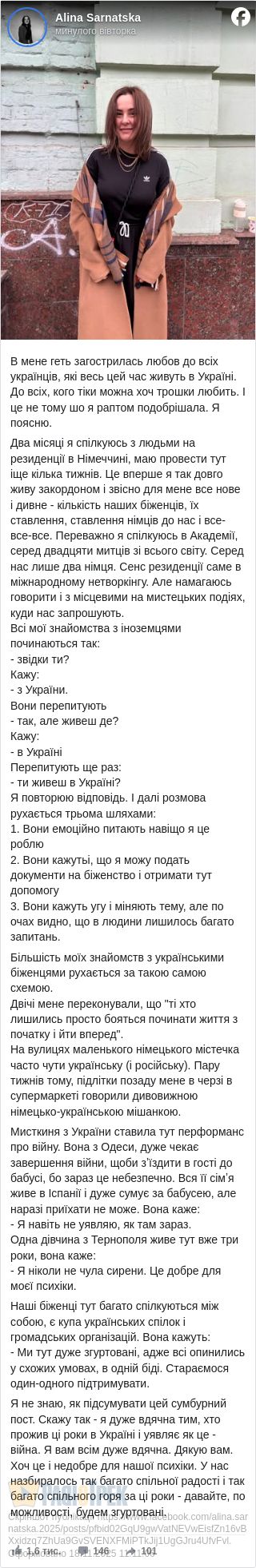 От, наприклад, цікавий допис української мисткині, яка кілька тижнів провела за кордоном: