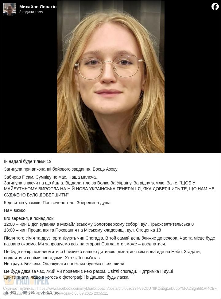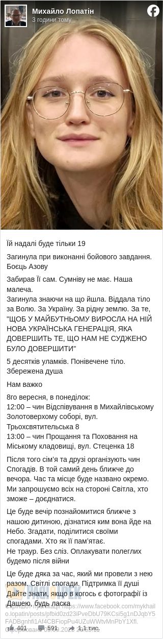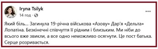 Який біль… Загинула 19-річна військова «Азову» Дарʼя «Дельта» Лопатіна. Це пост батька