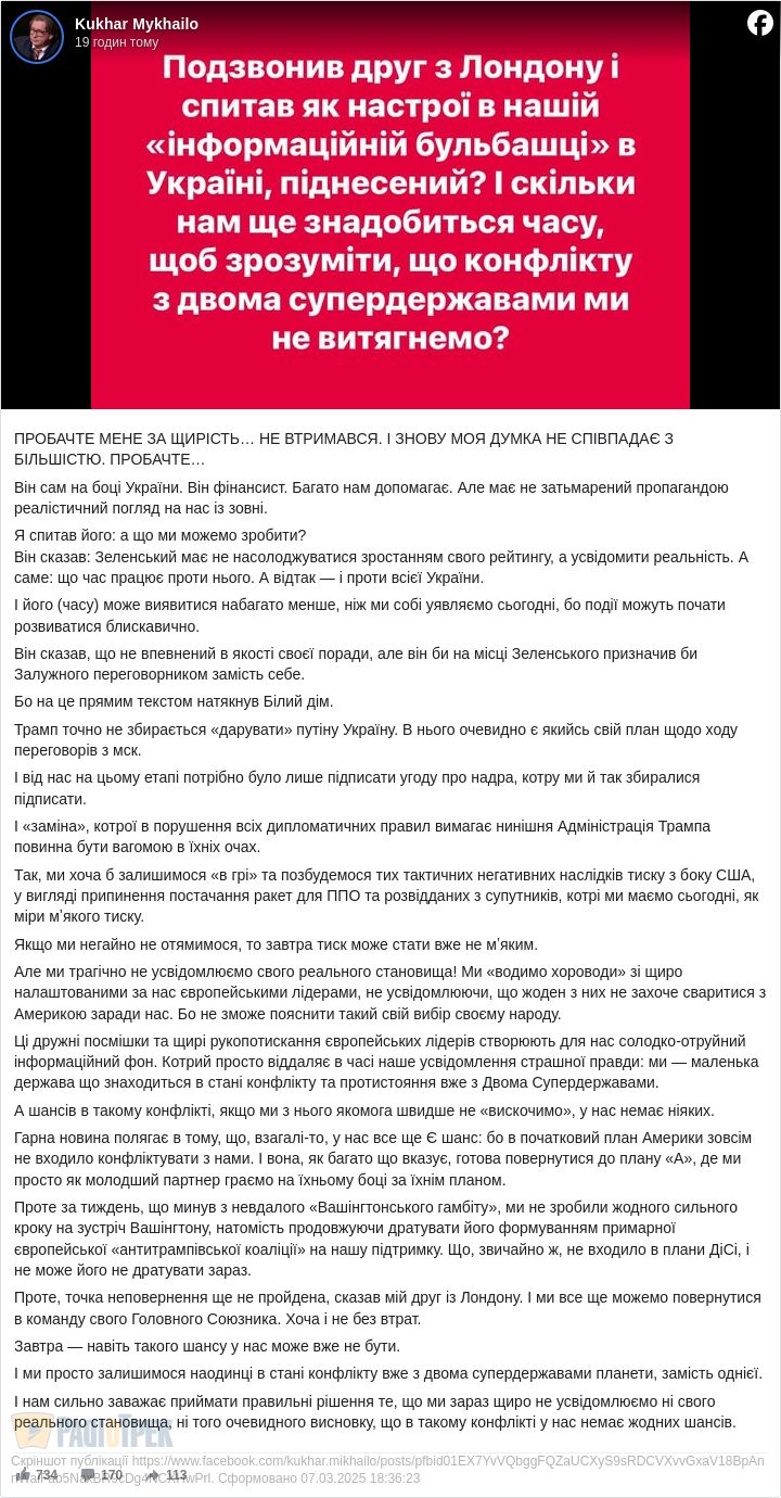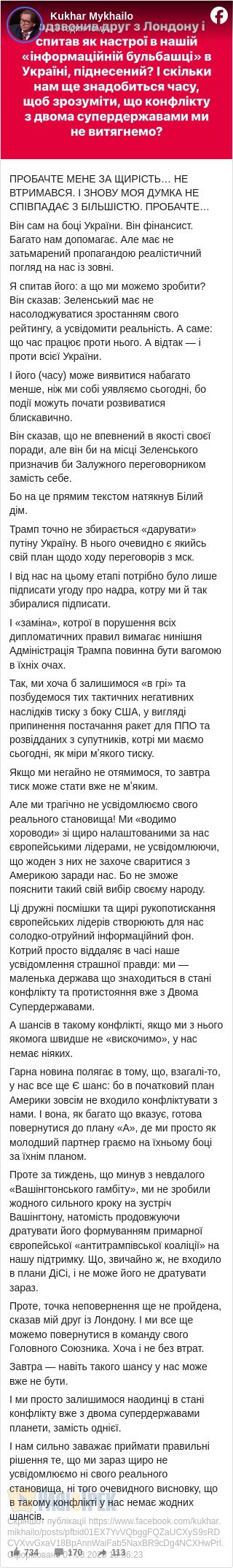Він сам на боці України. Він фінансист. Багато нам допомагає. Але має не затьмарений пропагандою реалістичний погляд на нас із зовні.