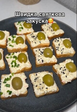 Красиво викласти на деко нашу закуску та прикрасити на смак. Для прикраси можна використовувати оливки, маслини, зелень, ікру, зелену цибулю, кунжут або насіння.