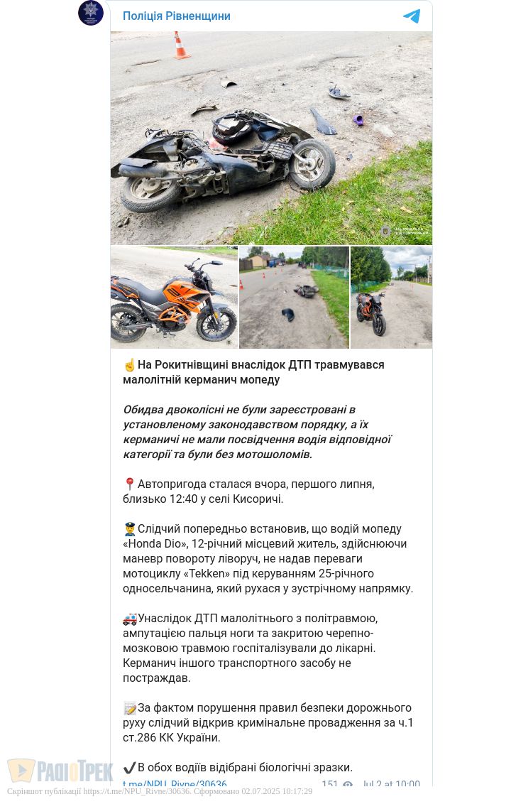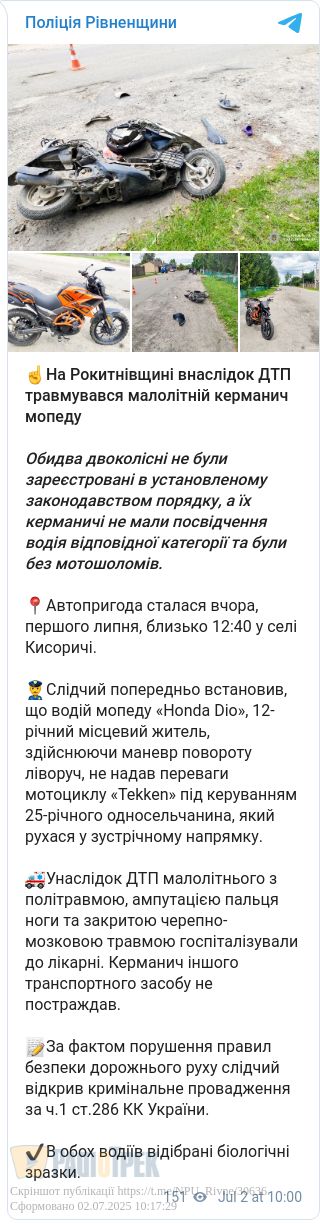 Унаслідок ДТП школяра з політравмою, ампутацією пальця ноги та закритою черепно-мозковою травмою госпіталізували. Водій мотоцикла не постраждав, повідомили у відділі комунікації поліції Рівненщини.
