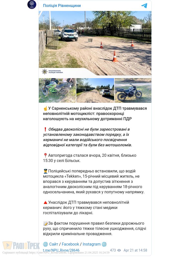 Неповнолітній мотоцикліст тяжко травмувався у ДТП у Сарненському районі. Аварія сталася на Великдень у селі Більськ.