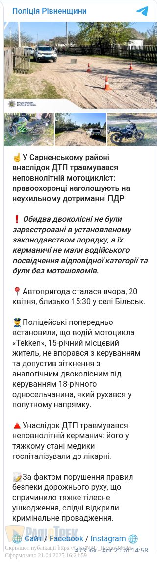 Обидва транспортні засоби не були зареєстровані, а хлопці не мали шоломів і водійського посвідчення. Обставини аварії встановлюють слідчі.