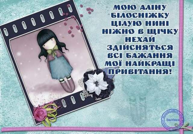Вітаю, дорога Аліно! Нехай очі іскряться від щастя. Нехай серце ловить натхнення від любові. Нехай життя грає яскравими фарбами. Нехай доля радує вдалими днями. Бажаю тобі, Алінко, здоров'я, енергії, краси, гармонії, любові, успішного саморозвитку і самодостатності.