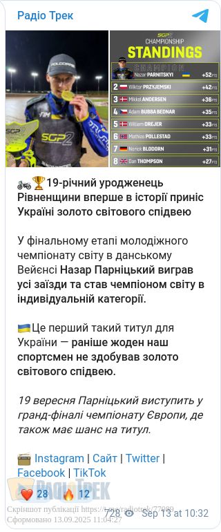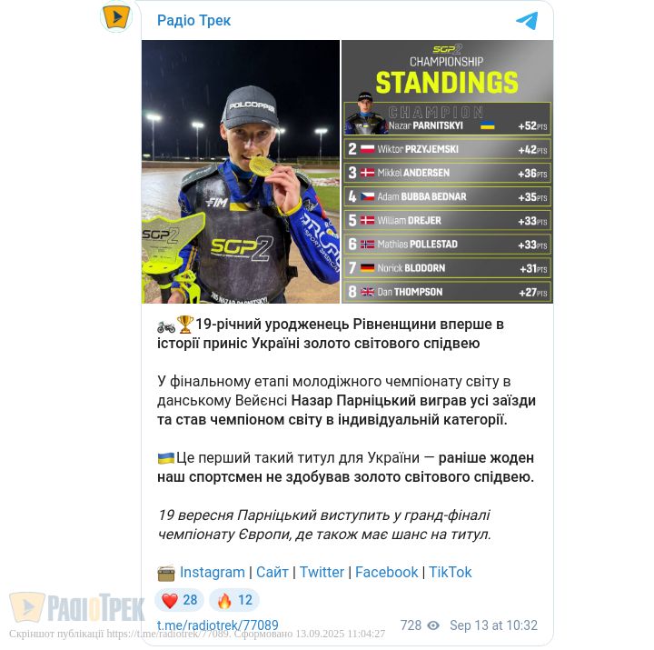 19-річний хлопець з Рівненщини вперше в історії приніс Україні золото світового спідвею