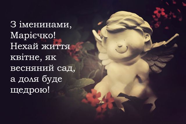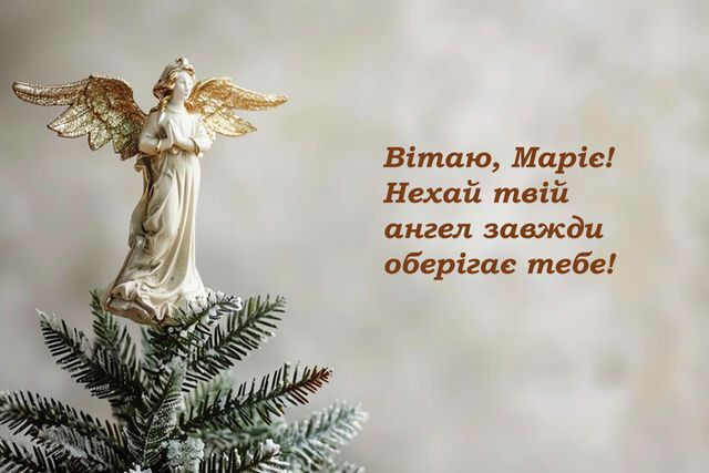 Вітаю, Маріє! Нехай твій ангел-охоронець завжди буде поруч, підтримуючи тебе у всіх твоїх починаннях, оберігаючи тебе від зла та негативу, даруючи тобі мудрість, силу для подолання будь-яких труднощів, натхнення та творчу енергію. Бажаю тобі безмежного щастя, міцного здоров’я та здійснення всіх твоїх мрій.