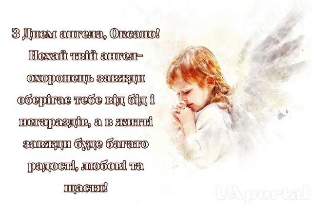 З Днем ангела, Оксано! Нехай твоє серце завжди буде наповнене любов'ю, а твоя душа – світлом. Бажаю, щоб твій життєвий шлях був таким же яскравим, як твоя посмішка. Нехай ангел-охоронець завжди супроводжує тебе, охороняючи від будь-яких негараздів.