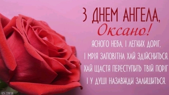 Вітаю, Оксано, з Днем ангела! Бажаю бути оптимістом, адже твій ангел-охоронець обов'язково захистить тебе від усіх негараздів. Бажаю вірити в себе, прагнути до кращого і завжди досягати бажаного. Оксано, нехай кожен світанок приносить з собою енергію і натхнення. Нехай кожен захід обіцяє виконати мрію. Успіхів тобі й всіх благ!