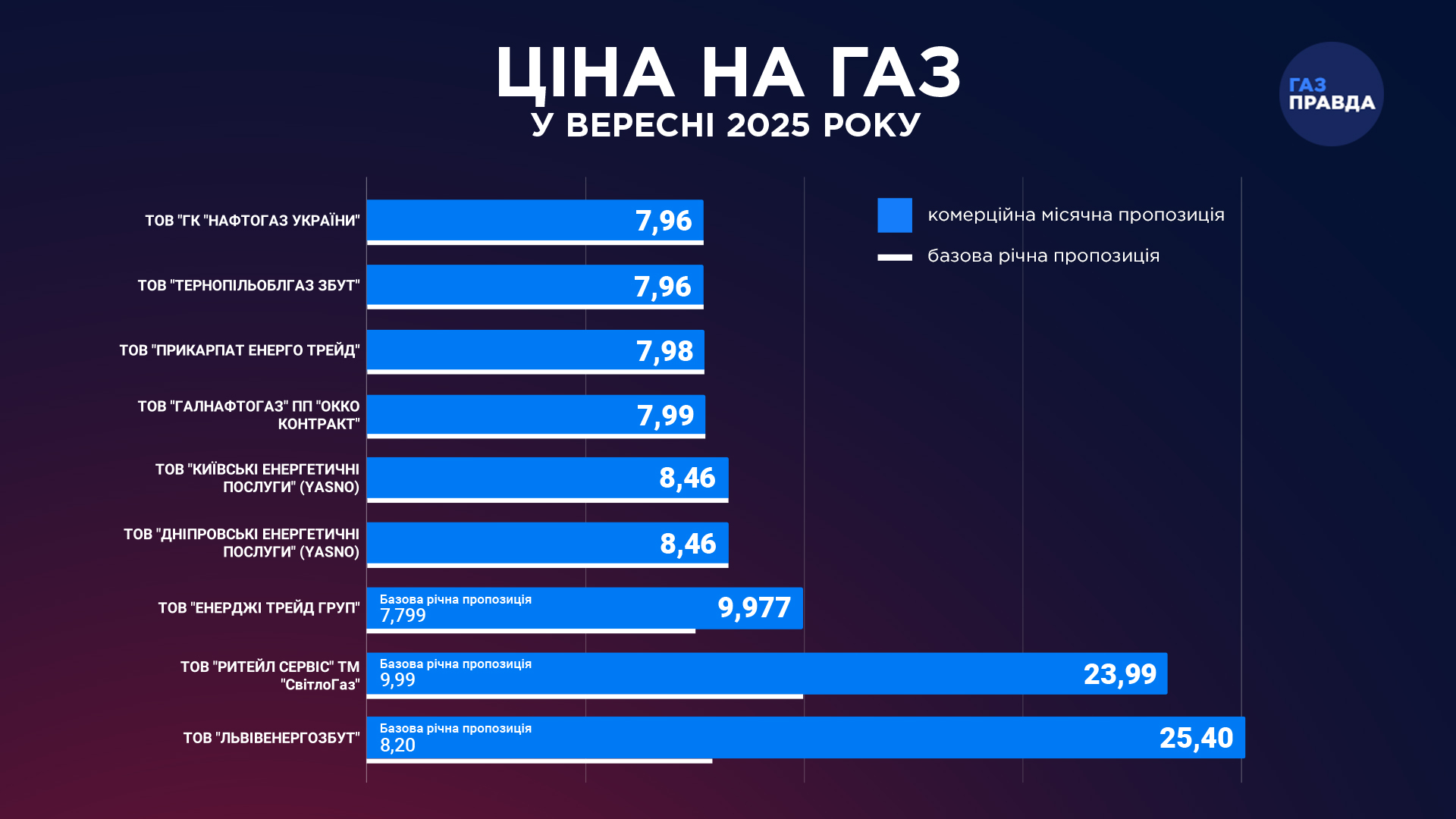 За даними традиційного огляду цін ГазПравди, на ринку постачання природного газу побутовим споживачам, як і раніше, присутні 9 постачальників, 5 з яких пропонують і річні, і місячні (ринкові) тарифи.