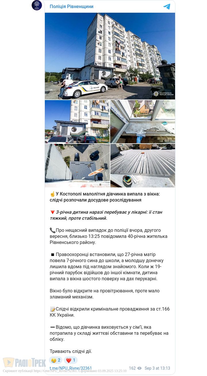 У Костополі малолітня дівчинка випала з вікна. Правоохоронці встановили, що 27-річна матір повела 7-річного сина до школи, а молодшу донечку лишила вдома під наглядом знайомого.