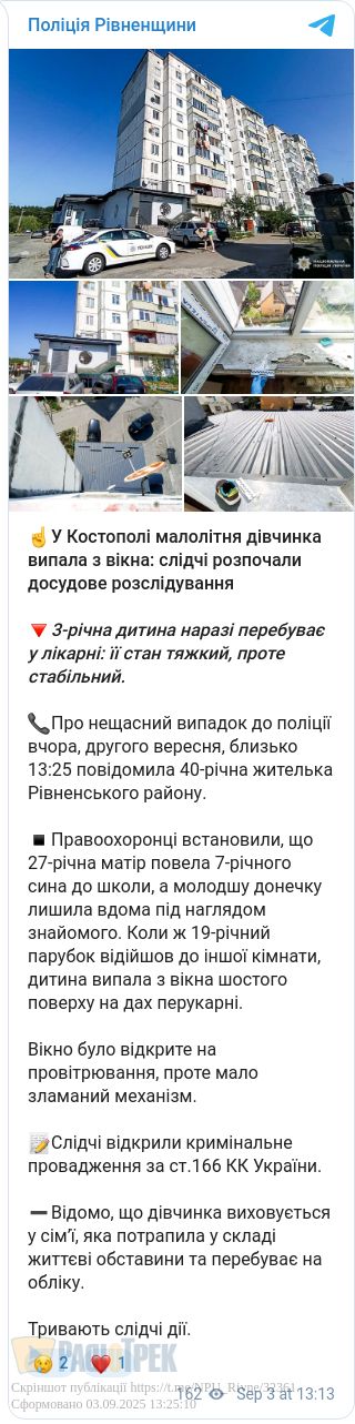 Вікно було відкрите на провітрювання, проте мало зламаний механізм. Дитина наразі перебуває у лікарні: її стан тяжкий, проте стабільний. Слідчі відкрили кримінальне провадження.