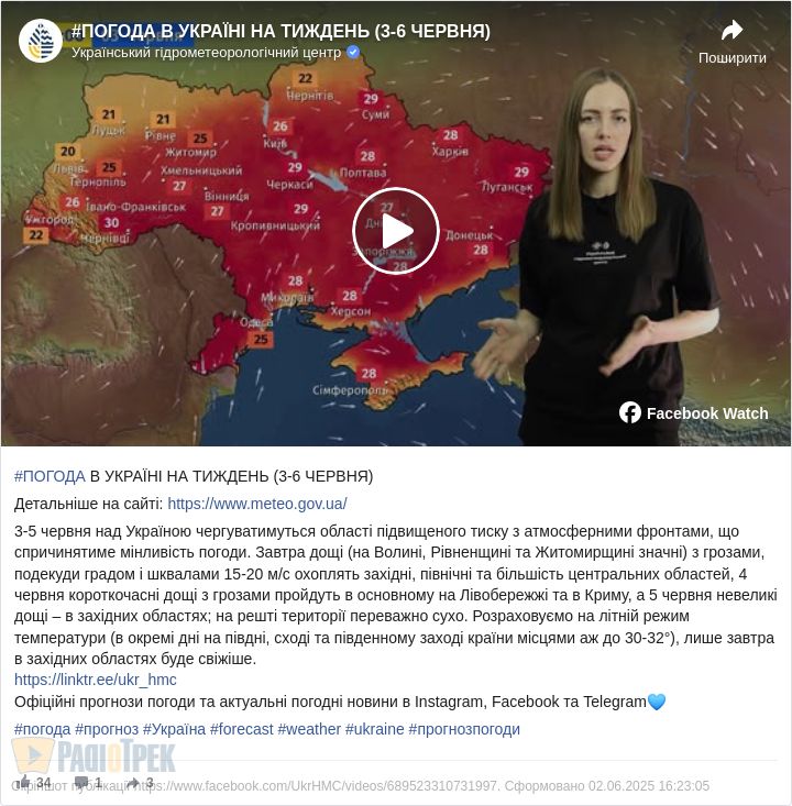 У середу 4 червня короткочасні дощі з грозами пройдуть в основному на Лівобережжі та в Криму, а 5 червня невеликі дощі можливі в західних областях. На решті території країни очікується переважно суха погода.