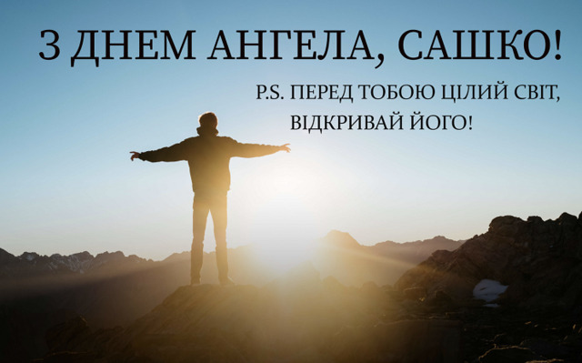 Вітаю, Олександре, з Днем ангела! Нехай він завжди буде поруч і вберігає від помилок. Бажаю бути сміливим завойовником, мужнім переможцем. Нехай кожен день обіцяє тобі успіх, достаток і везіння. Бажаю тобі, Сашку, здоров'я, сил, амбіцій, поваги й змін в житті тільки на краще!