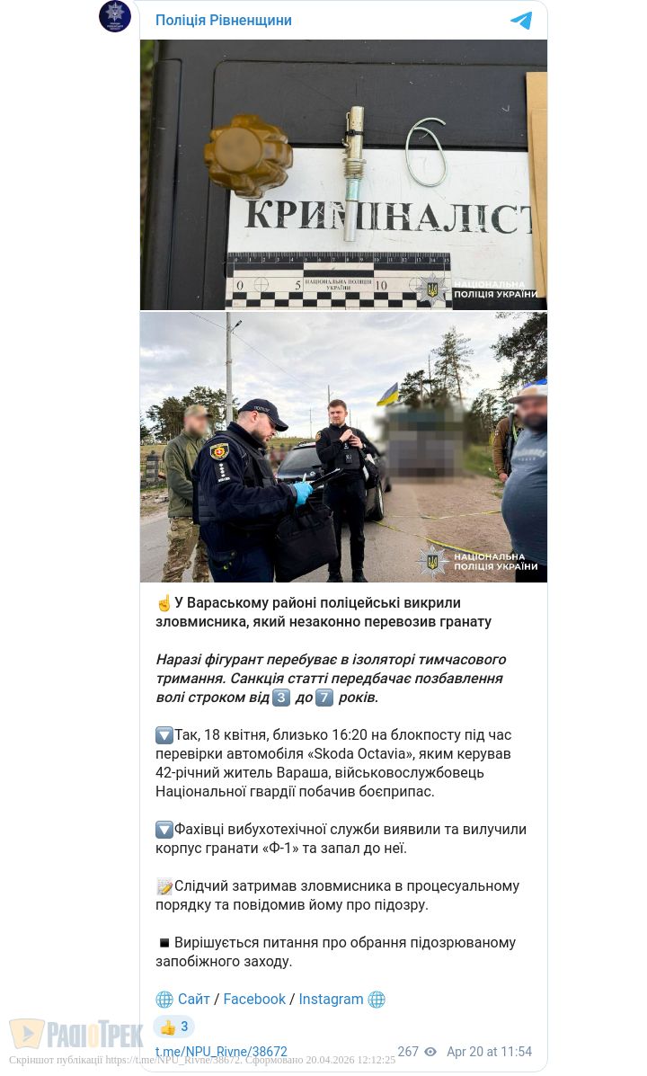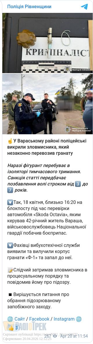 42-річний мешканець Вараша перевозив гранату: Йому «світить» 7 років ув'язнення