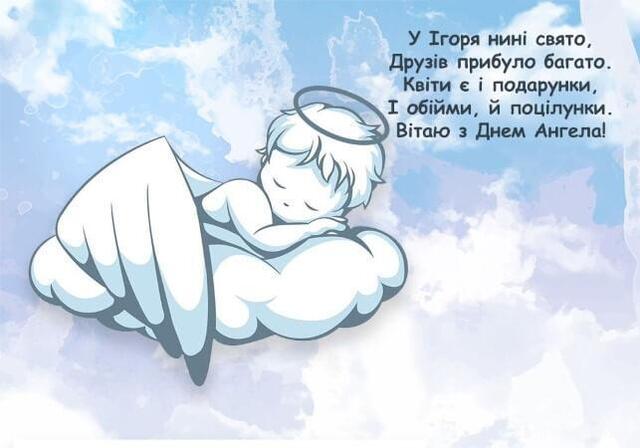 Дорогий Ігорю, вітаю з днем ангела! Нехай твій ангел-охоронець завжди стоїть на сторожі твого здоров’я, щастя та добробуту. Бажаю тобі здійснення всіх мрій, успішної кар’єри, міцного здоров’я та стабільного фінансового становища. Нехай кожен твій день буде сповнений світла, радості та нових можливостей. Щастя тобі, тепла і благополуччя у всіх починаннях!