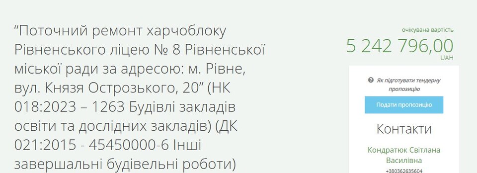 У документі йдеться, що управління капітального будівництва проведе ремонтні роботи харчоблока Рівненського ліцею № 8.