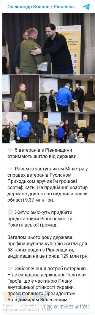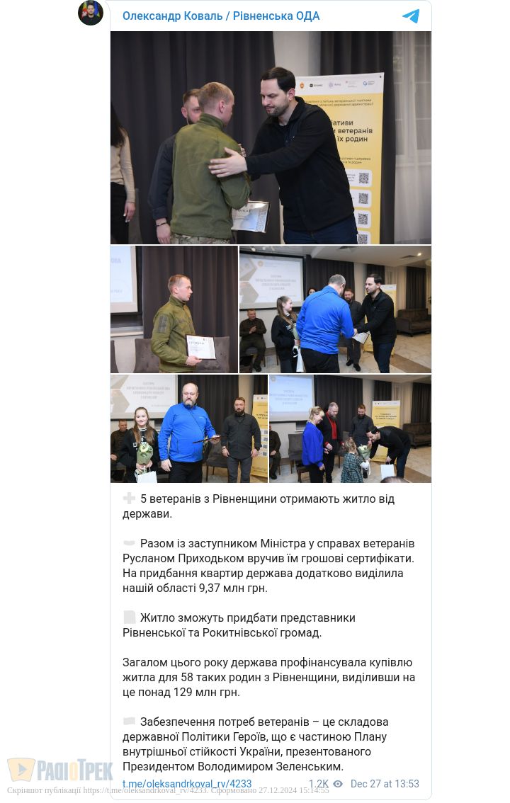 5 ветеранів із Рівненщини отримають житло від держави. Днями їм вручили грошові сертифікати на загальну суму — майже 9,5 млн грн.