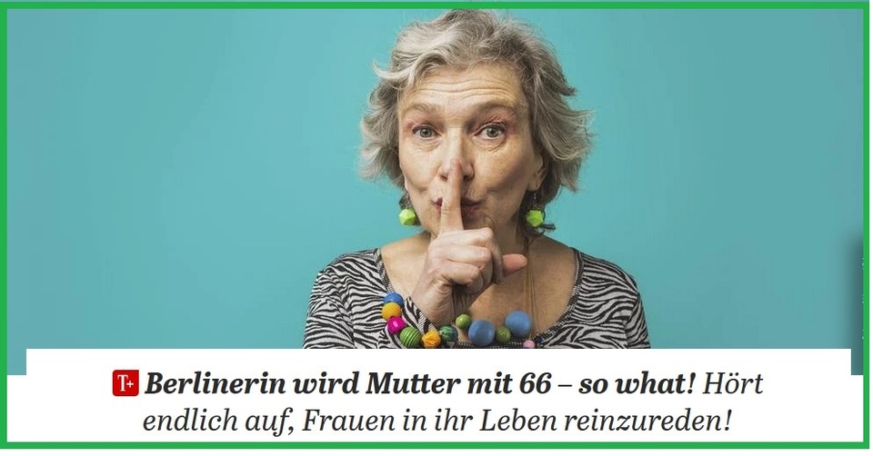 «Народила в 66 — і що?» - пише колумністка Tagesspiegel Даніела Мартенс. Ніхто не робить сенсації з того, що чоловік у 66 став батьком — так і тут не потрібно.