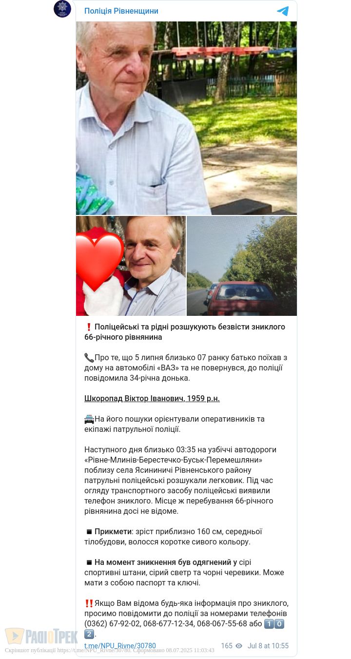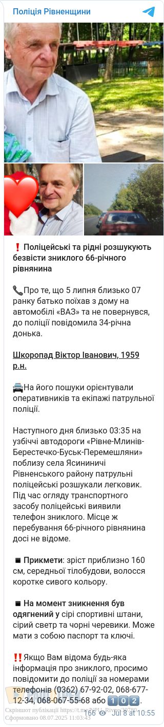 На Рівненщині донька розшукує свого 66-річного батька Віктора Шкоропада. Чоловік ще 5 липня поїхав з дому на автомобілі «ВАЗ» та не повернувся.