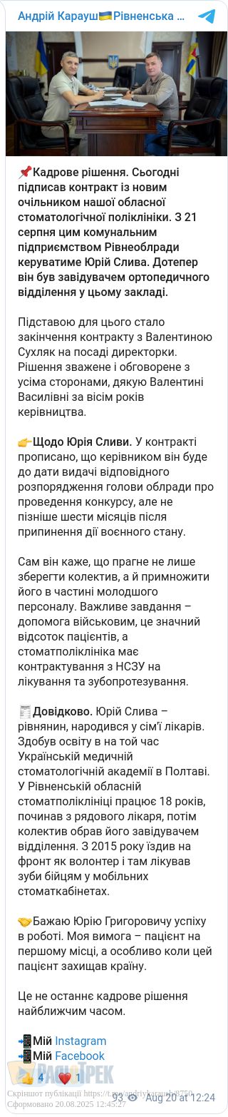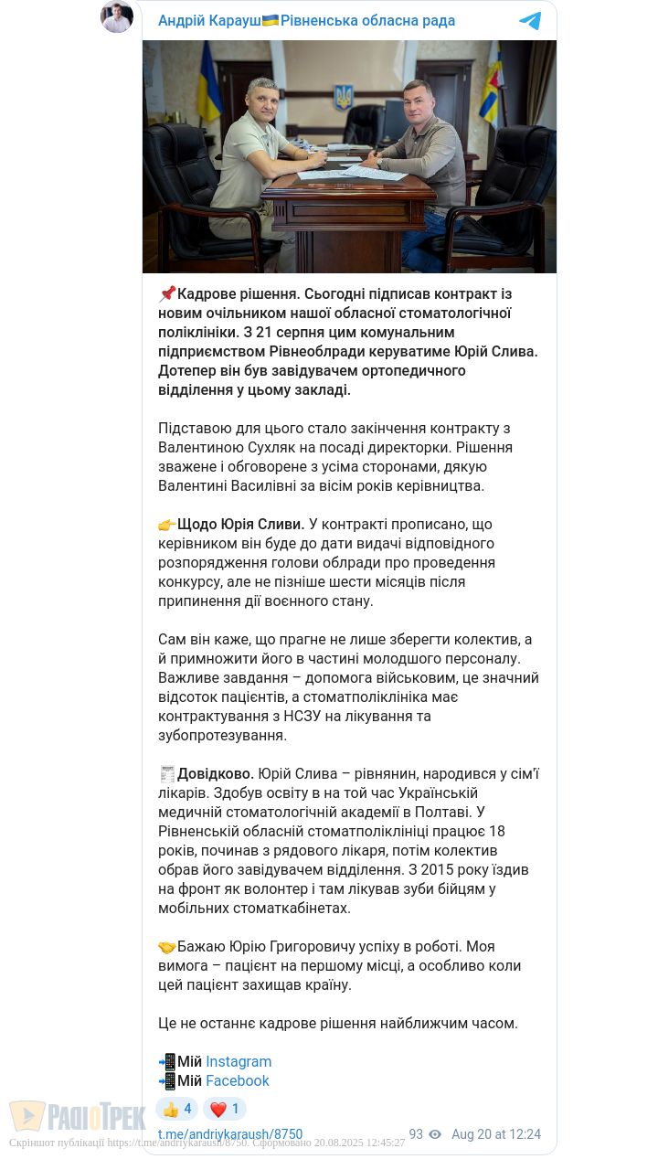 Надалі керівником стоматполіклініки буде Юрій Слива. Контракт із ним сьогодні підписав голова Рівненської облради. Раніше він був завідувачем ортопедичного відділення у цьому закладі.