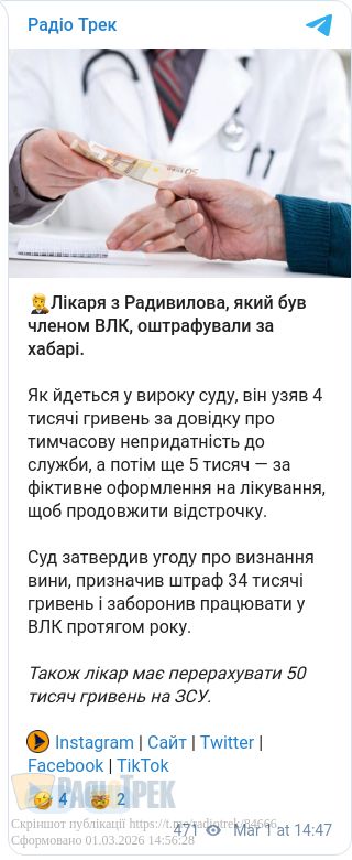 Лікаря з Радивилова, який був членом ВЛК, оштрафували за хабарі.