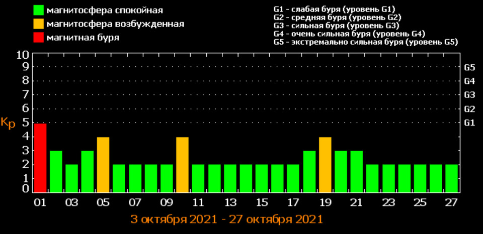 Жовтень розпочнеться з сильної магнітної бурі. Сонячна активність досягне рівня 5 балів. Це єдина велика буря в жовтні. Наступні збурення на Сонці середньої сили очікуються 5, 10 і 19 жовтня.