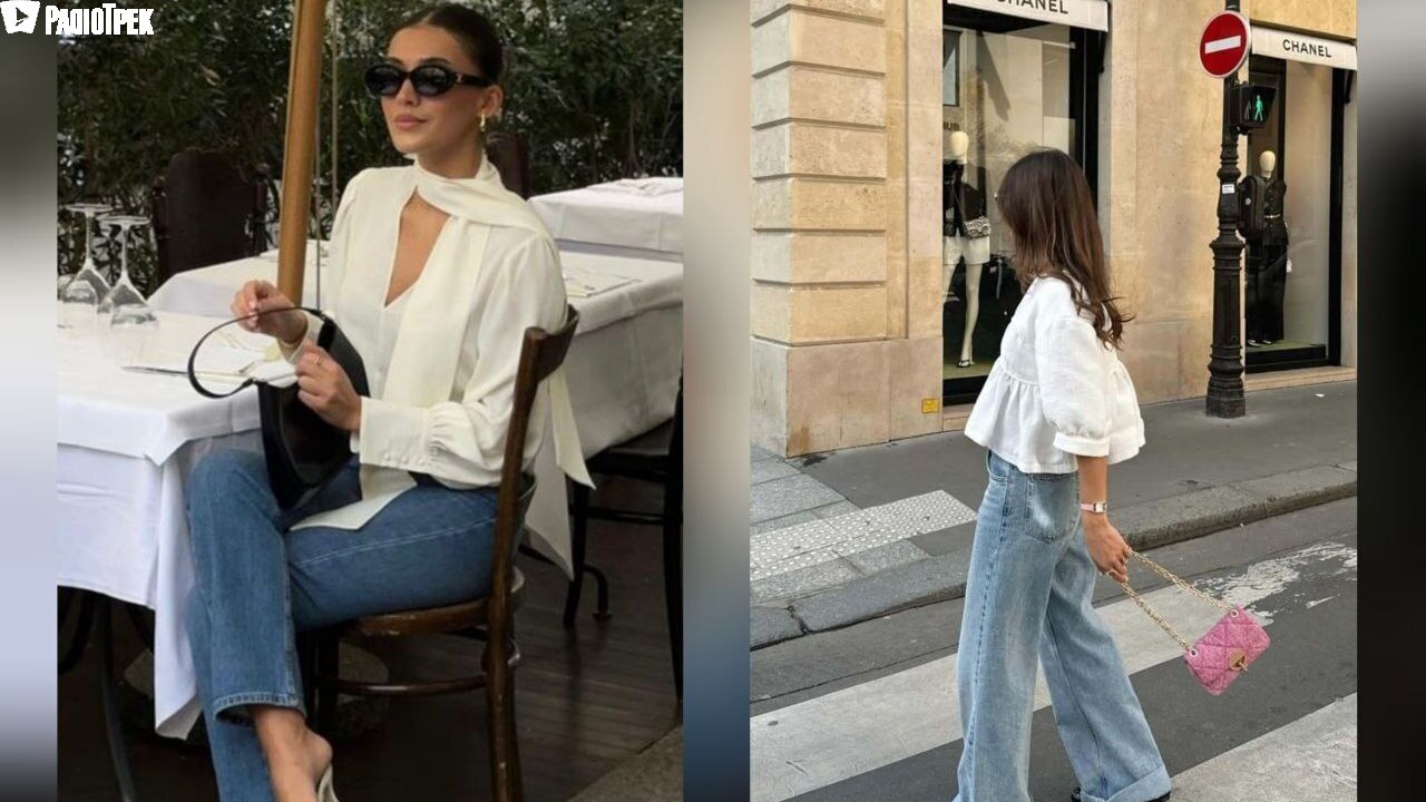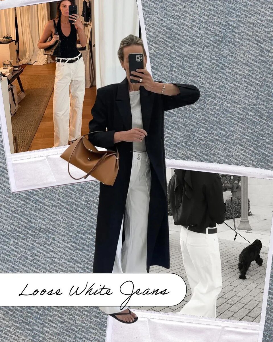 Легкі, просторі білі джинси — ідеальний варіант на літо. Вони пасують до базових футболок і майок, особливо в поєднанні з чорними аксесуарами.