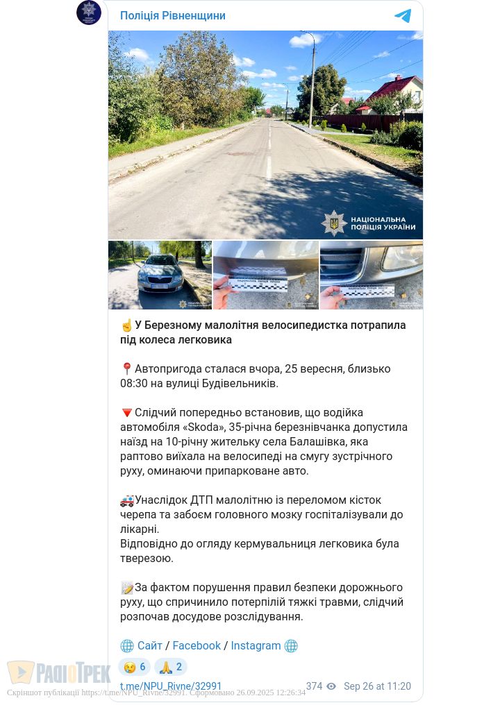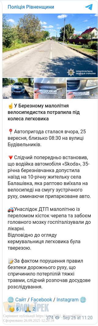 Унаслідок ДТП малолітню із переломом кісток черепа та забоєм головного мозку госпіталізували. Відповідно до огляду, кермувальниця легковика була тверезою.
