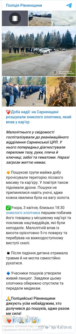 Малолітнього у свідомості госпіталізували до реанімації Сарненської центральної лікарні. У нього попередньо діагностували переломи тазу, руки, плеча й ключиці, забої та гематоми. Наразі його життю нічого не загрожує.