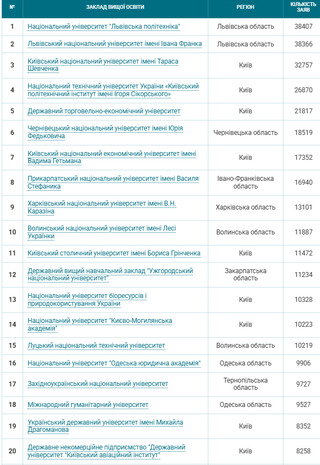 На 18-му місці опинився Міжнародний гуманітарний університет, який отримав майже 10 тис. заяв – торік він не потрапив і у двадцятку.